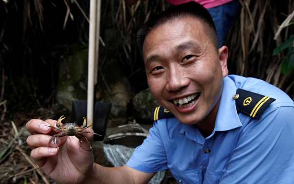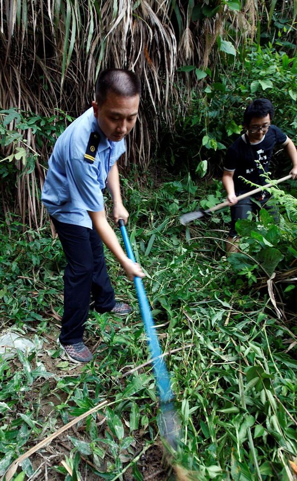 大伙从老乡家借来两把柴刀,在两米多高的杂草丛中搜索水源。