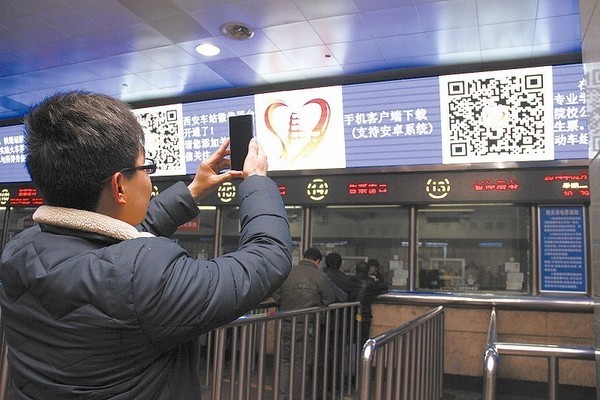 旅客可通过手机下载客户端和微信关注订阅号的方式,实时查询余票、列车正晚点、车站公告等信息,并可在线咨询、预约重点旅客帮扶等服务。图为一名旅客在售票大厅用手机扫描 “西安车站微助手”二维码。唐振江 摄