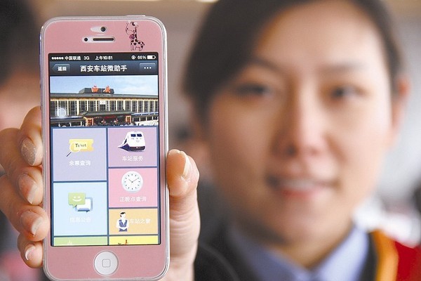 旅客可通过手机下载客户端和微信关注订阅号的方式,实时查询余票、列车正晚点、车站公告等信息,并可在线咨询、预约重点旅客帮扶等服务。图为西安站工作人员用手机展示 “西安车站微助手”查询界面。唐振江 摄