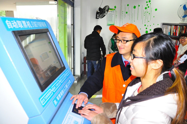 火车票自动取票机进驻西南石油学院校园。一名学生在青年志愿者的指引下办理取票。胡志强 摄