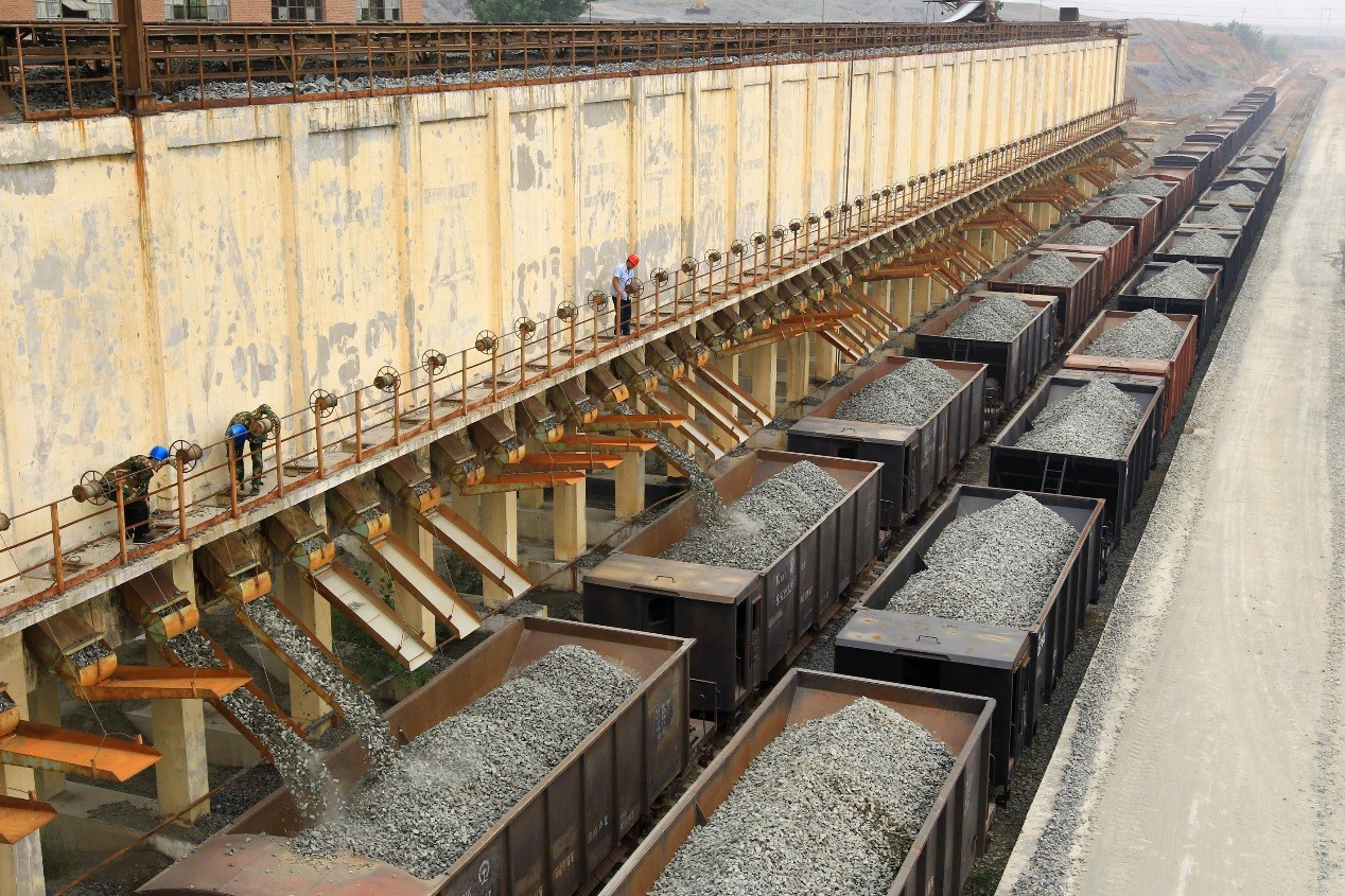 工人们将料仓中的成品道砟溜装到风动卸砟车上,通过铁路运输到全国各地施工地点。