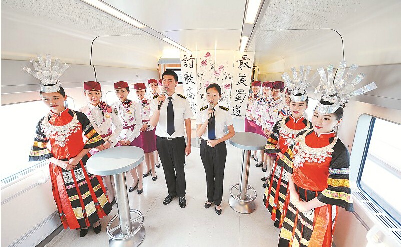 在江油至成都东C6313次动车组列车上,“最美蜀道·诗歌高铁”成都铁路局服务文化建设活动拉开帷幕。“蜀道难,难于上青天。”大诗人李白在1000多年前如是说。如今,铁路的快速发展已让天堑变通途。而诗歌高铁的出现,更是让这样一种景象变得可能:在飞驰的动车组列车上,旅客吟诵着“蜀道之难”,望向车窗外的大美蜀道风光,心中顿生感慨与豪迈之情。这就是诗歌高铁的特别之处。一路欢笑一路情,诗歌高铁丰富的不仅仅是旅客的蜀道之行,更是他们的人生旅途。