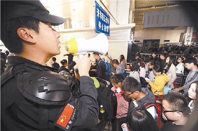 节后返程客流高峰,大同站公安派出所民警在进站口维持秩序。