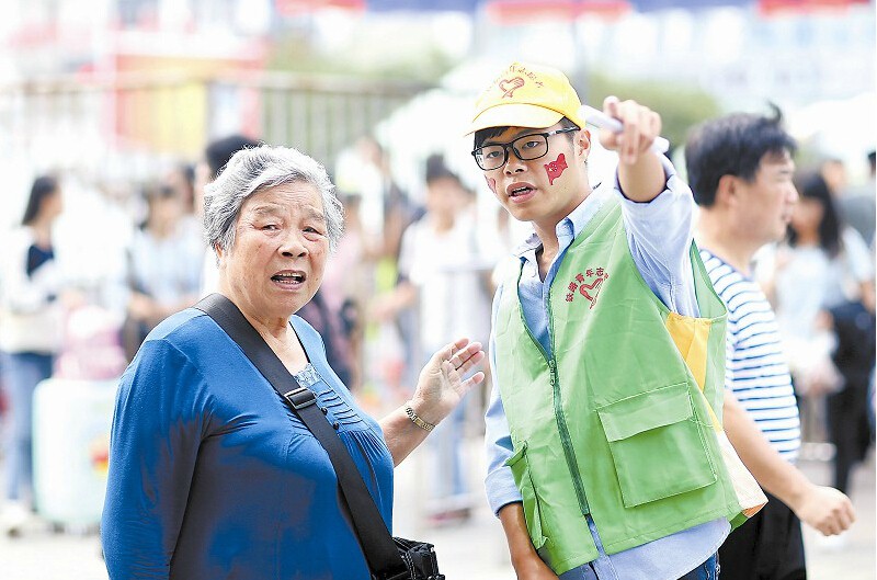 今年10月1日是王国庆19岁生日,他决定到南昌站当一天志愿者。图为王国庆正在告诉老奶奶遗失物品认领处的位置。