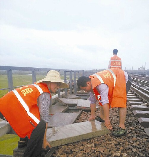 台风 “彩虹”来袭,玉林工务段玉林路桥车间职工冒雨清理侵限的步行板。
