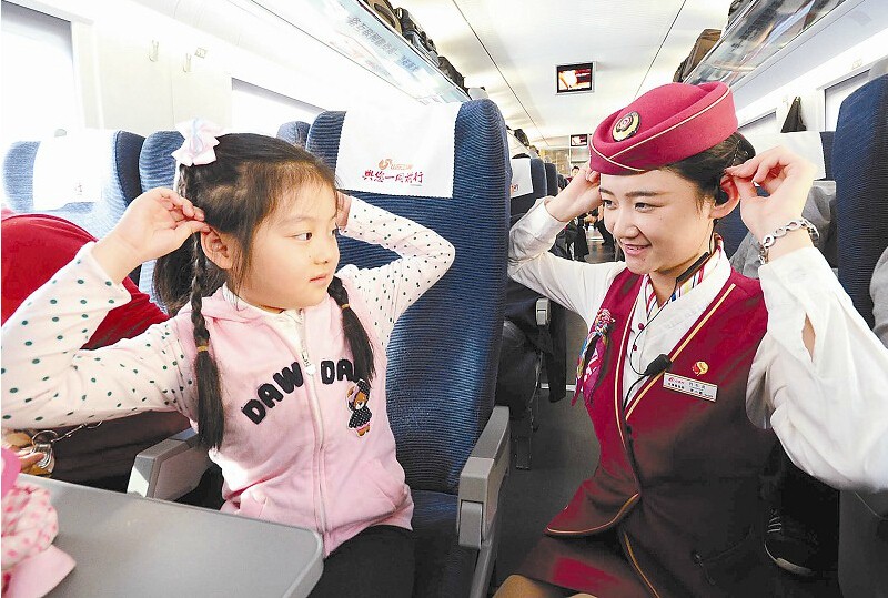 在天津客运段担当的G219次列车上,乘务员正在教小旅客做防耳鸣保健操。