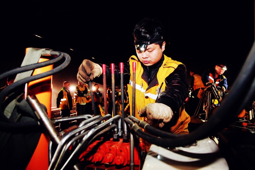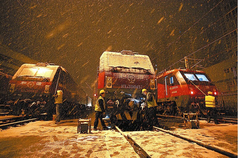 西安铁路局西安机务段专检专修组职工迎风冒雪精检细修机车,为春运提供充足的动力保障。 刘翔 摄