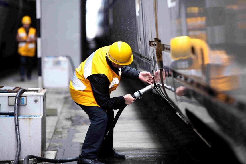 成都东站上水工为“和谐号”动车组上水。胡志强 摄
