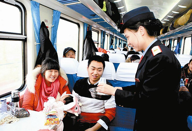 K668次列车员热情地帮带孩子回乡的旅客热奶。高锦旭 摄
