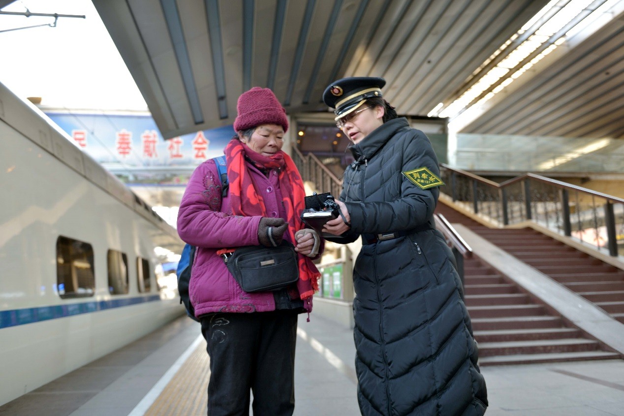 D25次列车长在站台为旅客解答问询。王博轩 摄