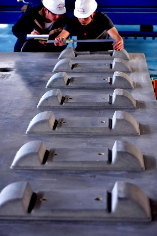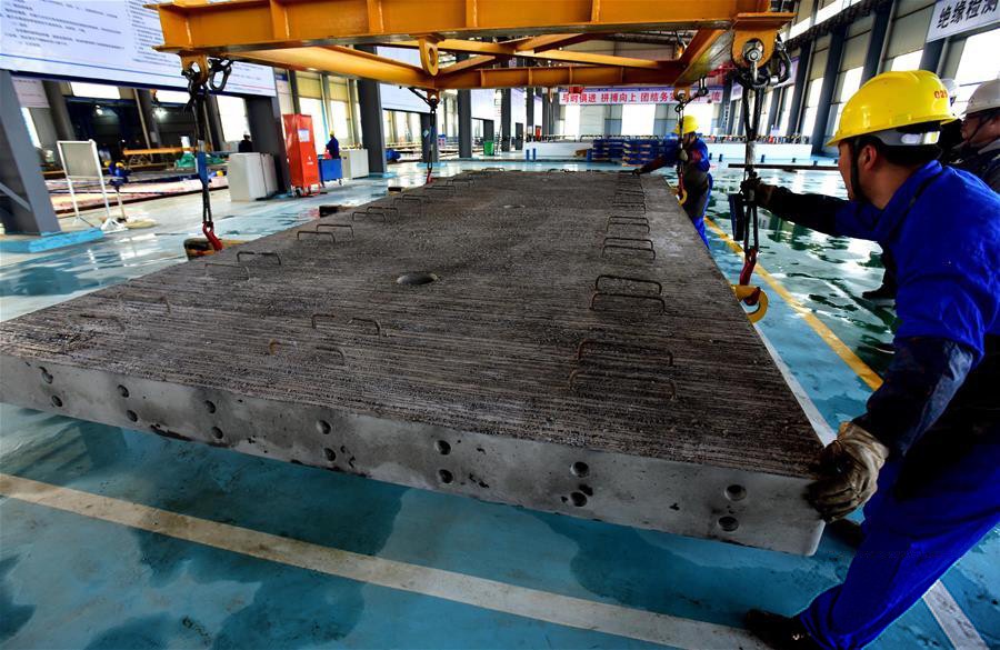 作业人员在起吊完成水中养护的CRTSIII型无砟轨道板。