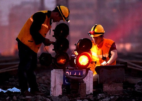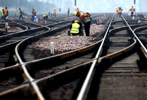 施工人员在交错的铁轨间更换信号设备。