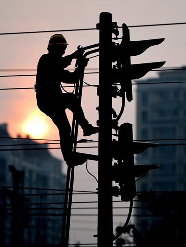 施工人员攀登信号灯杆进行设备调试。