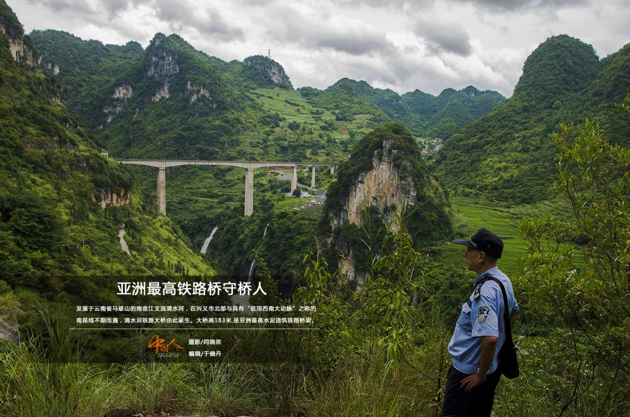 发源于云南省马雄山的南盘江支流清水河,在兴义市北部与具有“祖国西南大动脉”之称的南昆线不期而遇,这便是清水河铁路大桥的由来。183米高的清水河大桥,是亚洲最高水泥浇筑铁路桥梁。2006年,48岁的杨福明来到兴义车站派出所清水河西警务区,在大山深处开始自己的守桥工作。