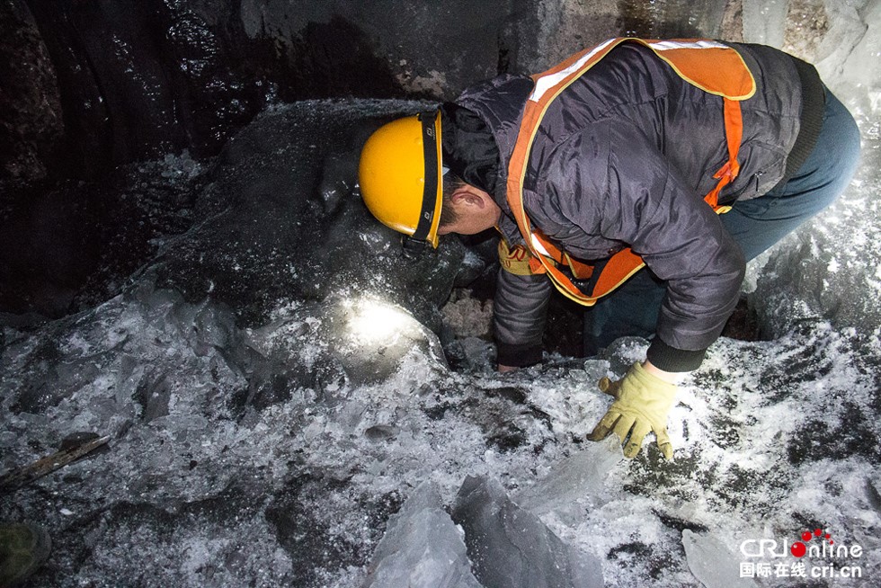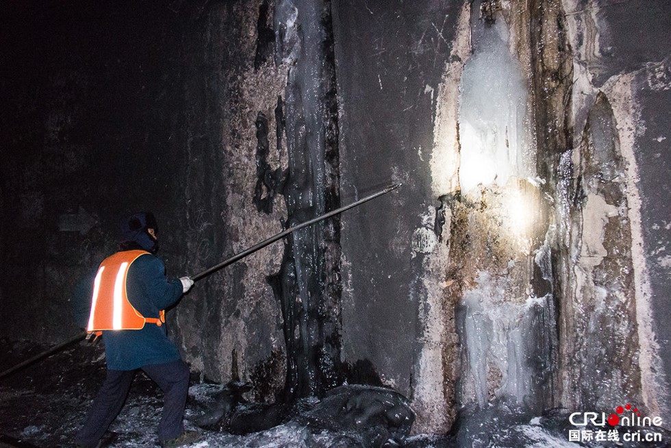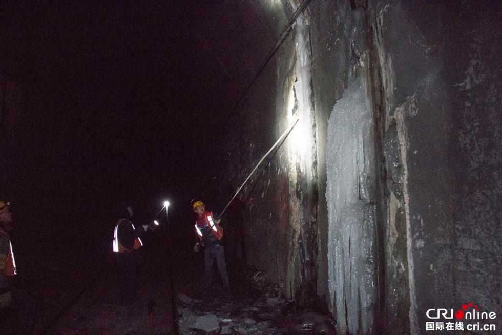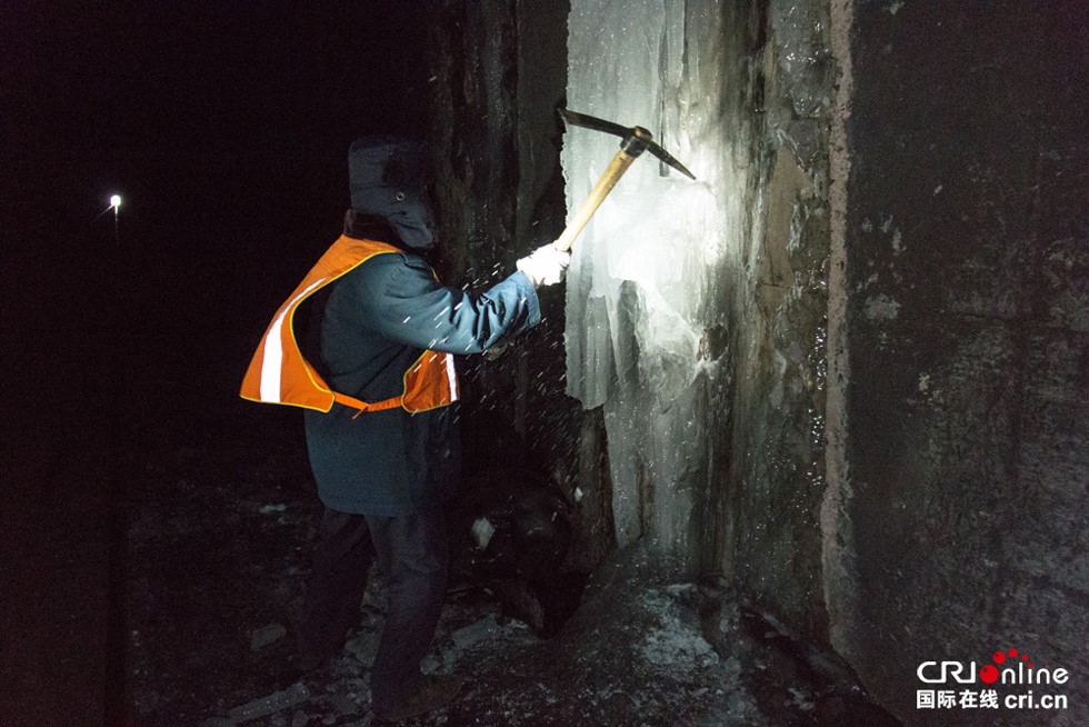 “顽固”的部分就要用大头镐来对付了。隧道里作业照明全靠手电和头灯,除此之外漆黑一片。不断掠过的阵阵寒风冻得人有些打哆嗦,但零下5度已经算是“暖和”,最冷的时候这里曾到零下19度。