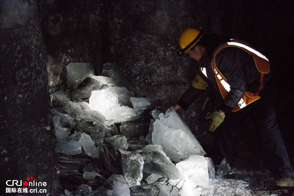 由于清理下来的冰块又大又重,并且作业时间比较紧张,所以它们会被统一堆放到不远处的一个避车洞里,等到有空时再背出去。尽管一刻不停地忙碌着,工人们清理这一处严重结冰点已经用掉了大约20分钟,清出的冰块近1立方米。后面还有几处结冰点需要检查,他们争分夺秒。