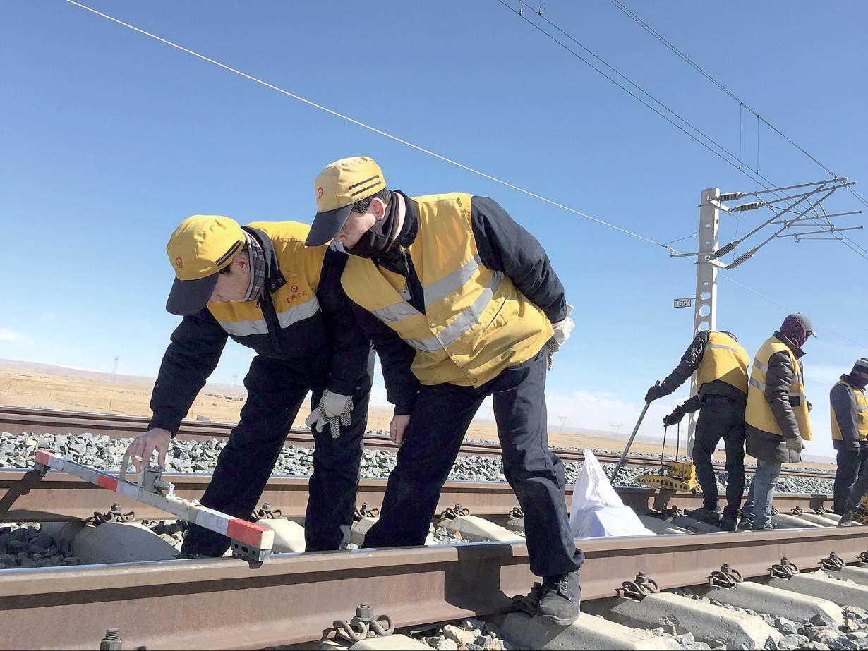 驱车行驶在曲折蜿蜒的砂石路上,来到海西蒙古族藏族自治州与海北藏族自治州的交界处,记者依稀看到了不远处铁路边上的工区房,周边满是空旷的草地,耳畔只能听到呼啸的寒风声……在青藏铁路鸟岛——天棚铁路线的区间内,记者见到了52岁的张永青和王吉德来,他们手拿道尺正认真地对轨道进行着轨距测量和水平测量,站着不到半小时,记者的手已冻得僵硬,就是在这样恶劣的环境下,张永青和王吉德来每天都要保质保量地完成手中的作业,不是一年两年,一干就是28年。图为张永青和王吉德正在用道尺测量轨距。