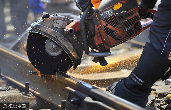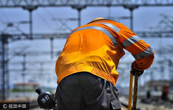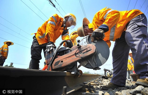 2017年7月12日,入伏第一天。中午11点10分,地表温度已经接近40度,京沪上行线晏城站k451+310m处,济南铁路局济南工务段的铁路焊轨工准备利用此时的天窗期进行换轨组作业。