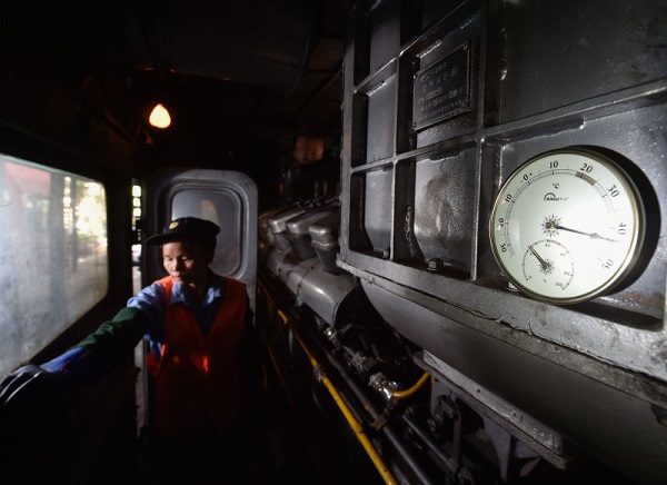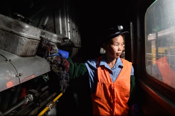 保洁工人冯新娣在一列内燃机车的机械间擦洗设备。为了防止被机器烫伤,她和工友们都会穿着长衣长裤、戴着胶皮手套作业。