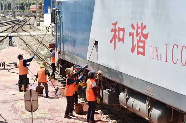 保洁工人在对火车头进行外部清洗,此时地表温度超过50摄氏度。