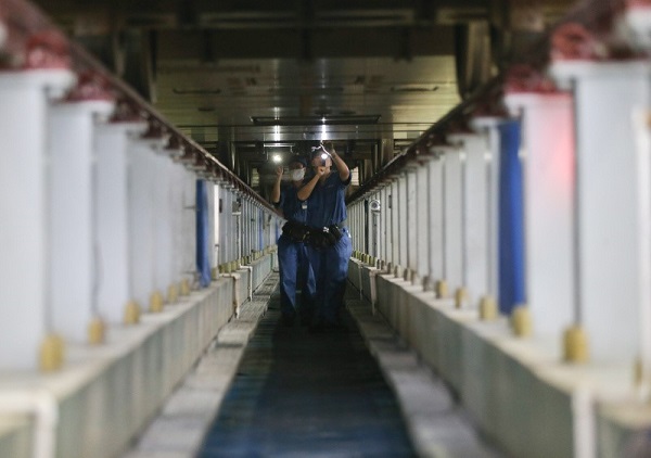 技术人员黄思远(右)与陈志春在对“复兴号”动车组列车进行车底检查。