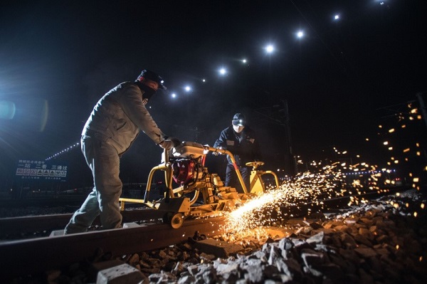 武汉高铁工务段的高铁线路工们在打磨钢轨。