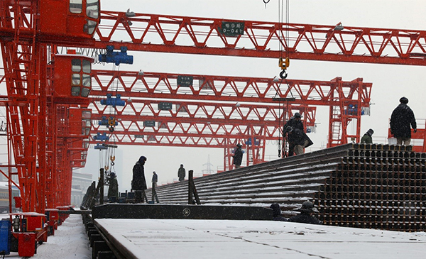 2018年1月17日,哈尔滨工务大修段职工顶着漫天风雪吊装钢轨。
