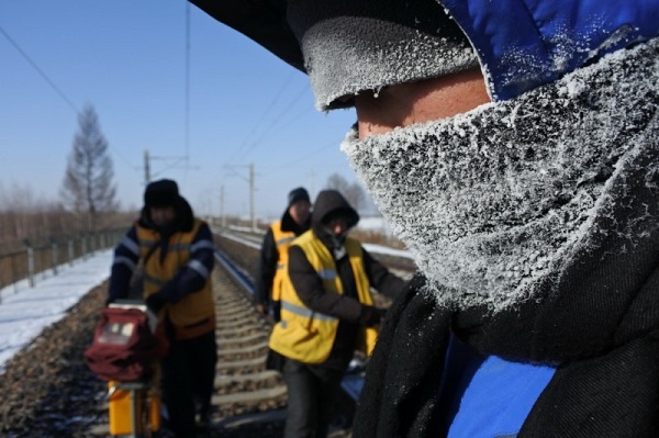 黑龙江省尚志市气温突破零下30摄氏度,承担养护任务的牡丹江铁路工务段职工冒着严寒,进行铁轨探伤作业,为铁路春运提供保障,他们的围巾和帽子上结着霜花。