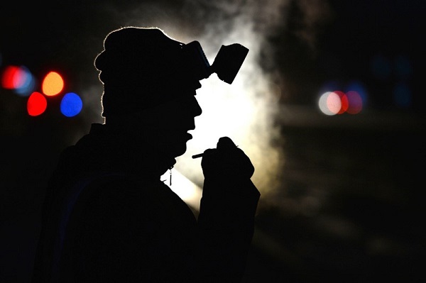 2月1日,漠河的气温低至零下20摄氏度。由于天气寒冷,加格达奇工务段漠河线路车间的线路工人邴玉勇在工作间隙哈气暖手。