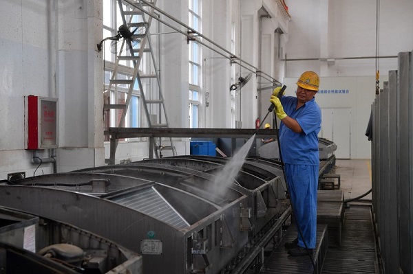 工作人员用高压水枪清洗列车空调外壳。