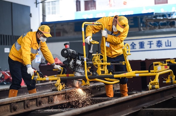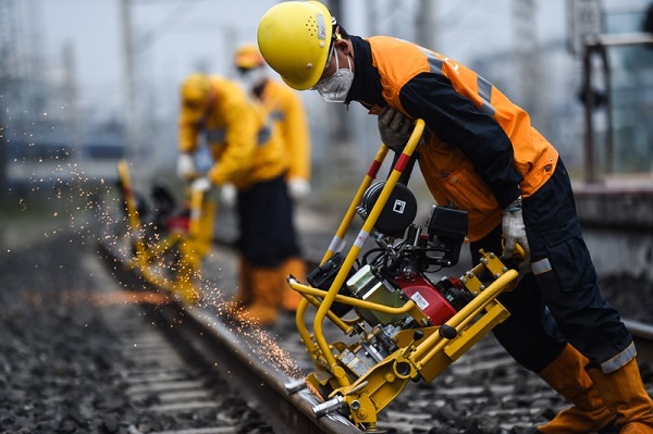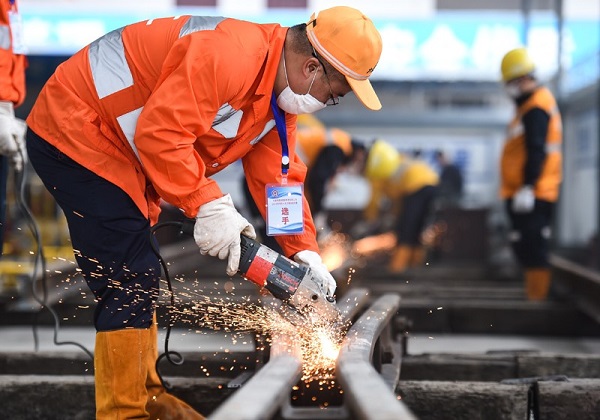 参赛选手在用翼轨打磨机进行焊缝打磨。