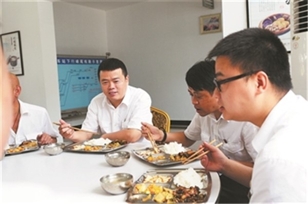 肖永红(左一)在食堂与车间职工交流,了解他们的所思所想,并征求意见建议。