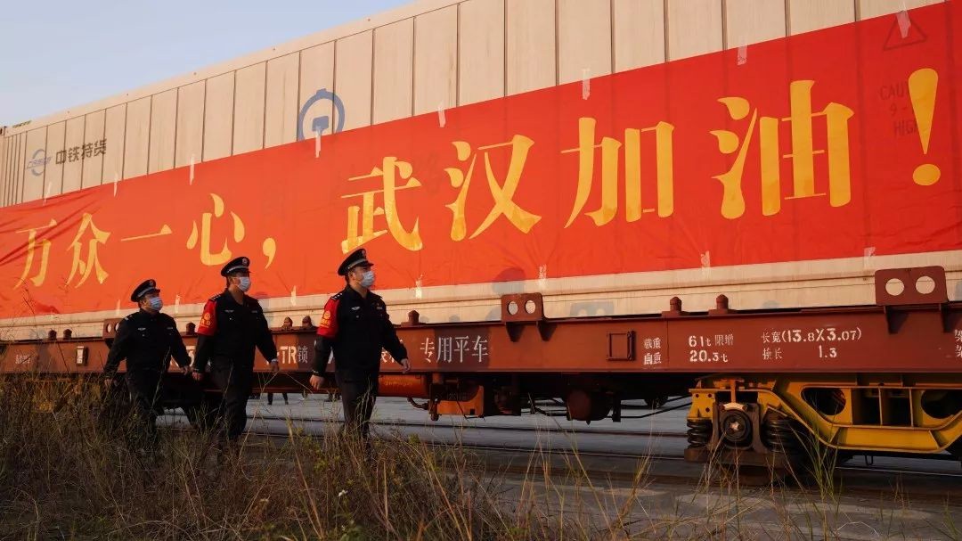 1月30日大年初六,南宁铁路公安处民警护航“广西首列驰援湖北武汉果蔬专列”。南宁铁路公安局 韦贺今 摄