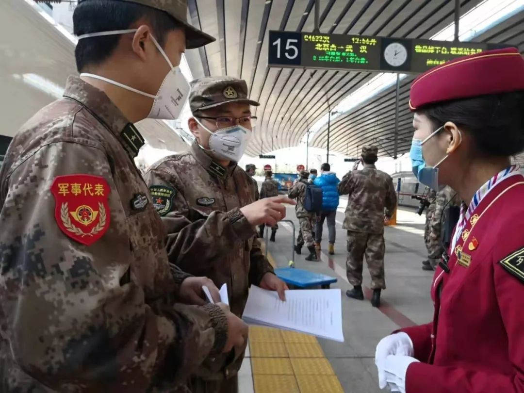 2月1日大年初八,部队医疗队在北京西站乘坐北京客运段担当乘务的动车组列车驰援武汉抗击疫情。