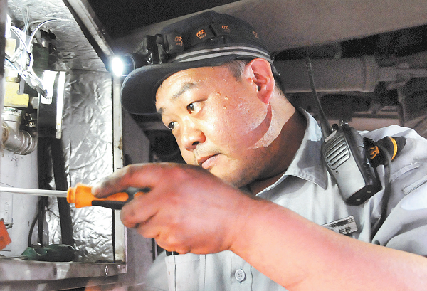 由于集便器电路系统位于车体下部,检修过程中,蒋明轶经常是头紧紧地贴在斜上60度的左臂上,使出全力才能拧动蝶阀。有时污水突然喷出,溅得满身满脸都是,但他早已见怪不怪了。