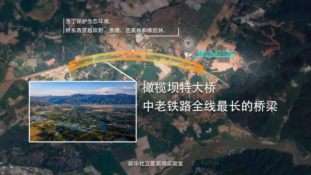 桥往往建在有江河沟壑的地方,而中老铁路橄榄坝特大桥却是个例外,修在了平坝上。这座桥是中老铁路国内段最长的桥梁,全长3.5公里,从空中俯瞰,就像在平坦绿地上画出的一道优美弧线。