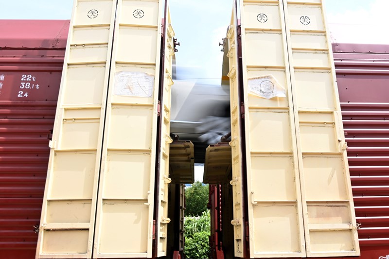 这些小汽车“乘坐”的火车是JSQ6型双层运输汽车专用铁路货车,每节车厢两端都可以打开,在车厢连接处铺上挡板,相邻的车厢就可以连起来形成通道。每节车厢可以装载9至15辆小汽车。其中一部分小汽车会“坐”着火车,通过铁海联运班列运往海外。