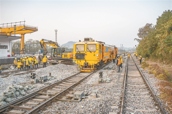 针对近期天气变化,铁路部门全面排查整治线路设备隐患,为线路设备进行“强筋壮骨”,为冬季铁路运输安全筑牢基础。图为中国铁路南宁局集团公司柳州工务机械段与桂林工务段携手,在全州站开展换岔施工。