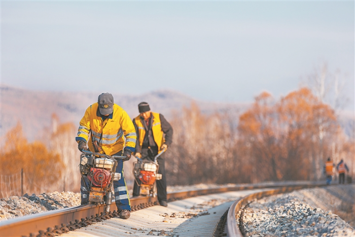 日前,东北大部迎来强降温天气。铁路部门积极做好设备检修和隐患排查工作,全面提升设备质量,确保低温条件下行车安全。图为近日,中国铁路哈尔滨局集团公司海拉尔工务段图里河线路车间职工在牙林线进行应力放散施工。