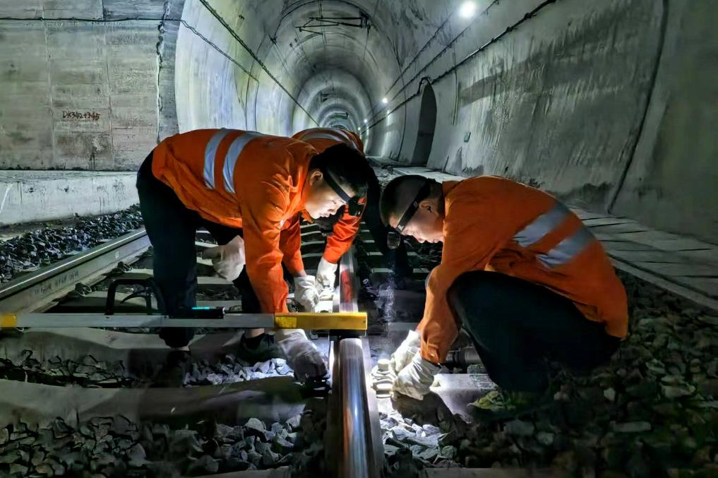 山区冬季昼夜温差常超过10摄氏度,为防止因热胀冷缩导致钢轨裂纹、断裂,午夜时分,南龙铁路“踏冷”巡线人一行9人出动了。他们身着橙黄制服,手持工具,扳手“啪啪”的敲击声和对讲机传来的指令声交织在一起。