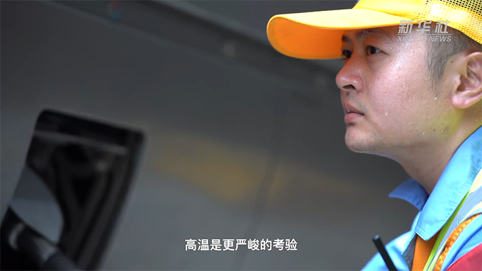 上水工的工作首先难在抢时间。列车停靠时间短暂,每节车厢都得完成注水。在车站400多米长的股道区域,上水工每天要走2万多步,为列车进行水源供应。除安全作业外,高温是更严峻的考验。在50℃的钢轨旁作业时,不到10分钟就全身湿透。