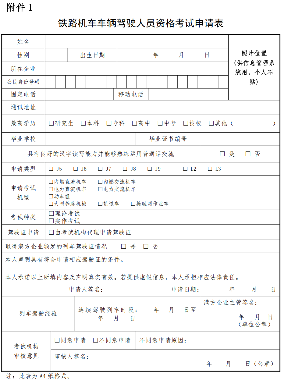 附件:1.铁路机车车辆驾驶人员资格考试申请表