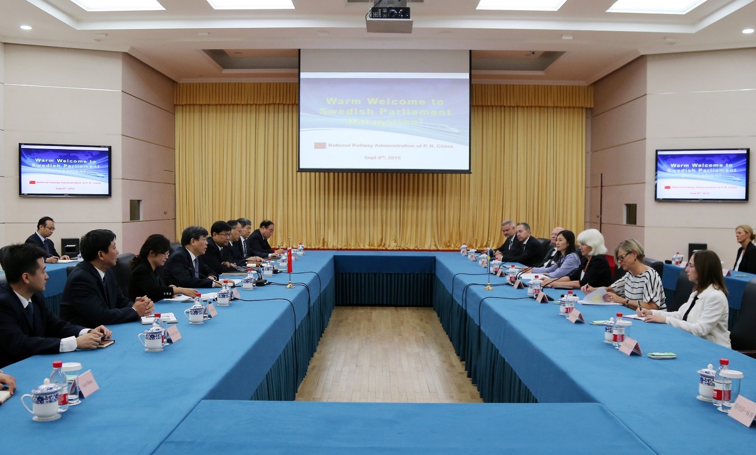 9月6日,国家铁路局局长陆东福(左四)在北京会见了瑞典议会交通与通信委员会主席卡琳·史密斯(右三)一行。双方就铁路合作,尤其是高速铁路发展广泛深入交流。瑞典驻华大使罗睿德陪同参加会见。