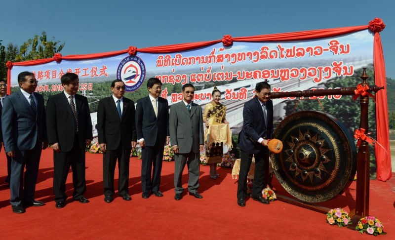 12月25日,中老铁路全线开工仪式在老挝琅勃拉邦举行,老挝总理通伦和中国驻老挝大使关华兵等出席开工仪式。中老铁路北起两国边境磨憨—磨丁口岸,南至万象,全长417公里,为Ⅰ级单线铁路,设计时速160公里/小时,预计建设期为5年。中老铁路建成后将与中国铁路网直接连通,对中国与东盟铁路互联互通具有重要意义。图为开工仪式现场。