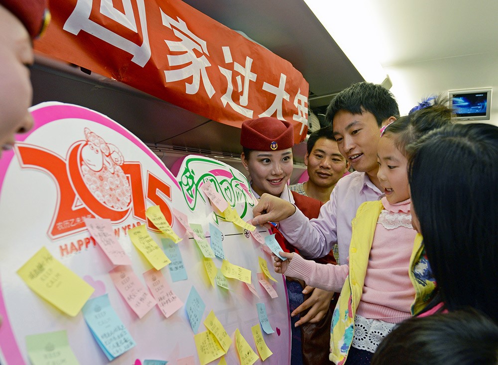 在厦门开往南昌的D6522次农民工动车专列上,630名在福建泉州务工的农民工携带子女和新年礼物,乘坐“年味专列”返乡与亲人团聚。图为乘客在心愿墙上写下新年心愿。