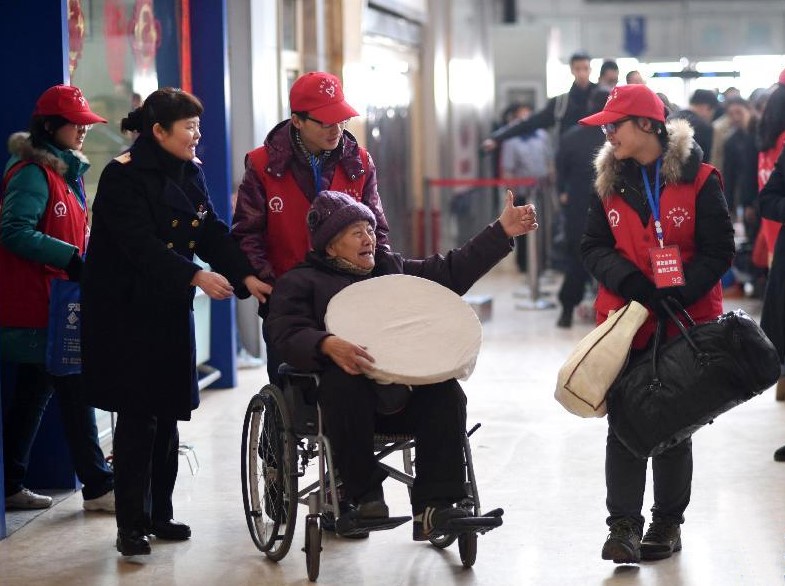 太原火车站,一位行动不便的老年旅客伸出大拇指称赞帮助她的铁路春运志愿者。
