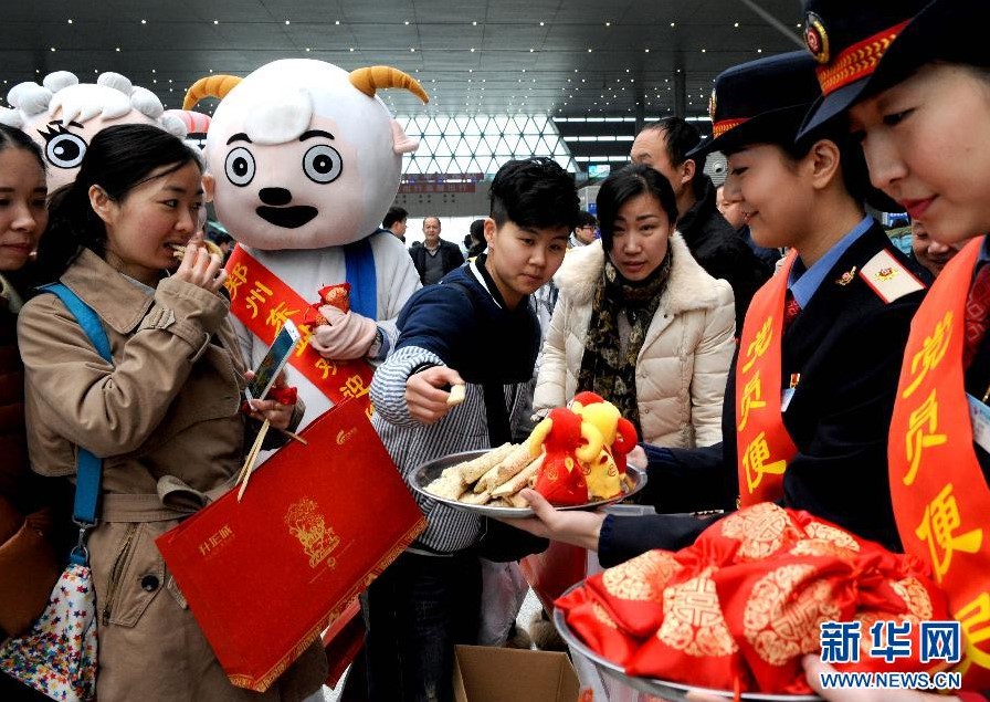 郑州东站工作人员在候车大厅,为旅客派送麻糖、春联、福袋等新年礼物,愿乘客带“福”出行。图片来源:新华社