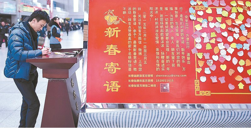 长春站候车室设立了“新春寄语墙”,让南来北往的旅客写下祝福。“新春寄语墙”贴满了旅客们对家人的关怀、对新年的期待和对远方的思念。图片来源:新华社