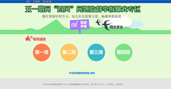 为贯彻落实十八届中央纪委第五次全会精神,继续抓好重要时间节点,紧盯“四风”新形式、新动向,畅通举报渠道,加大监督力度,中央纪委监察部网站推出《五一期间“四风”问题监督举报曝光专区》。“每周通报”栏目将从4月20日起,每周对各级纪检监察机关查处的违反中央八项规定精神案件进行点名道姓通报曝光。专区还设有网友留言区,欢迎广大网友就“四风”问题治理等建言献策。