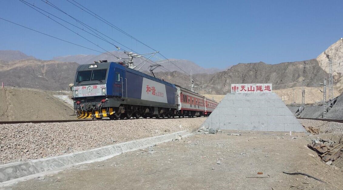 6月2日,南疆铁路吐鲁番至库尔勒增建第二线全面开通运营。图为列车驶过南疆铁路吐鲁番至库尔勒新增二线工程的“关键节点”——中天山特长隧道。